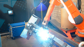 Mittelgroße Werkstücke schweißt Hörmann nun auf dem neuen QIROX "All in one"-System. Hier sind alle relevanten Komponenten auf einem gemeinsamen Grundrahmen angeordnet. Die Befestigung erfolgt über eine Bodenplatte, sodass keine Feinjustierung notwendig ist. Herzstück der Anlage ist der QIROX-Schweißroboter QRC-350-E. Dabei vereinfacht und beschleunigt die hohe Reichweite des siebenachsigen Roboters das Schweißen der teils komplexen Werkstücke. Durch den 2-Stationen-Aufbau kann der Roboter in einer Station die Bauteile schweißen, während in der anderen die Be- und Entladung taktzeitparallel stattfindet. Die Einspannlängen lassen sich durch das schiebbare Gegenlager stufenlos zwischen 2,50 und 3 m einstellen.