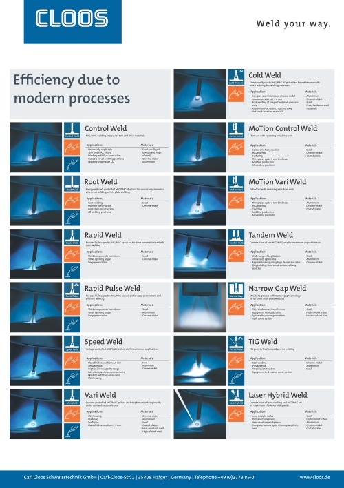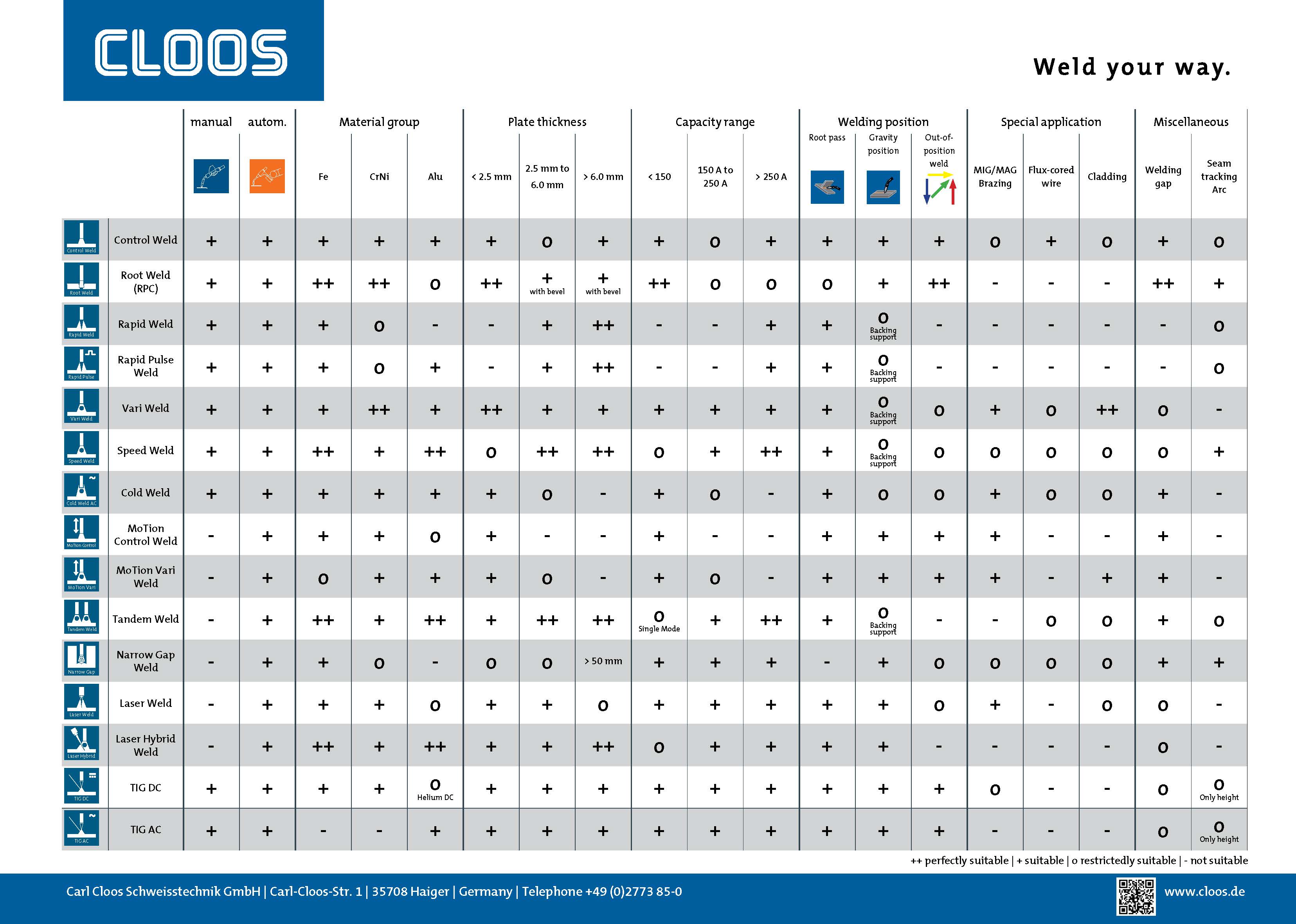 All welding positions at a glance? Which welding process is suitable for which material and which application? Which technical data does each welding process cover? We are asked these and similar questions again and again - now we have summarised the answers and presented them clearly on one poster each: