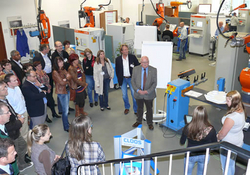 The factory tour started with a presentation in the training centre of the company which is used for internal as well as customers' initial and advanced vocational training. CLOOS attaches great importance to the training of specialists and engineers. About 50 % of the staff started their education at CLOOS. Every year the company offers many training positions for specialised technical and commercial jobs as well as some places for the dual system of vocational education and training. In total 33 young people are in the vocational training at CLOOS.